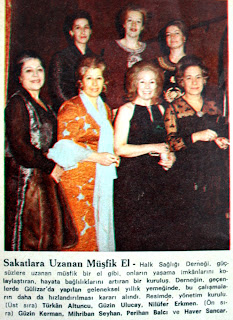 Sakatlara uzanan müşfik el : Halk sağlığı derneği, güçsüzlere uzanan müşfik bir el gibi onların yaşama imkanlarını kolaylaştıran hayata bağlılıklarını arttıran bir kuruluş. Derneğin geçenlerde Gülizar'da yapılan geleneksel yıllık yemeğinde bu çalışmaların daha da hızlandırılması kararı alındı. Resimde yönetim kurulu (üst sıra) Türkan Altuncu, Güzin Uluçay, Nilüfer Erkmen. (ön sıra) Güzin Kerman, Mihriban Seyhan, Perihan Balcı ve Haver Sancar...1973 |