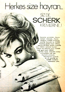 Herkes size hayran siz de SCHERK kremlerine...! Hayranlar çevrenizde. Hayran bakışlar cildinizde. Hayran olduğunuz Scherk kremlerinin yarattığı hayranlık bu. Scherk vanishing gündüz kremi cildinize eşsiz bir berraklık, tazelik ve güzellik verir. Cildinizi makyaja hazırlar. Cildinizi dış etkilerden korur. Scherk cold gece kremi cildinizi temizler, besler, dinlendirir. Sivilce ve kırışıklıkları yok eder. Hayranlık yaratacak, hayranlarınızı arttıracak bir cilt güzelliği için Scherk kremlerini kullanmanız yeter...1970 |