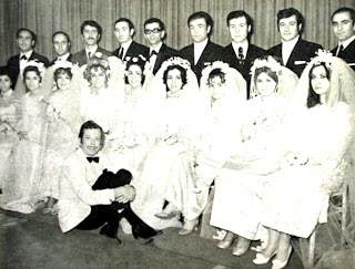 İkinci Mürüvvetlerinde : Ankara'daki Akalınlar düğün salonundan sonra İstanbul'daki Ömür salonu sahipleri de kuruluş yıl dönümlerinde bir yıl içinde lokallerinde hayatlarını birleştiren çiftler için özel bir gece düzenlediler. Bu anlamlı törene İstanbul içinde bulunan dokuz çift katıldı ve hepsi güle oynaya ikinci düğünlerini yaptılar. Üstte bu büyük düğüne katılan gelinlerden bir grup, sanatçı Enver Daniş'le göbek atıyor. En üstte ise gelin ve damatlar toplu halde soldan : Çorman, Akınlı, Öz, Akınönder, Özdoğanlar, Uyanık, Aşçı, Altındal ve Güvener çiftleri salon sahibi Selahattin Mandal ile...1971 |