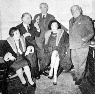Emektarlar : 19 yıl önce ilk defa bu tiyatroda sahneye çıkan Nedret Güvenç çok sevdiği dram tiyatrosu salonunda. On iki kurucudan geriye kalanlar : Şaziye Moral, Vasfi Rıza Zobu, H. Kemal Gürmen, Bedia Muvahhit, İ. G. Arcan (üstte) ve tiyatro ile emekliye ayrılan 25 yıllık emektar Zeynep hanım (altta). 1970 |
