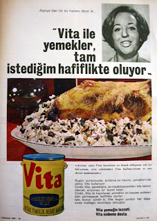Alanya'dan bir ev hanımı diyor ki : "Vita ile yemekler tam istediğim hafiflikte oluyor." "Ayrıca, eşsiz Vita lezzetinin ne demek olduğunu çok iyi biliyorum, zira eskiden beri Vita kullanıyorum ve son derece memnunum." Bugün yurdumuzda binlerce ev hanımı yemeklerinde yalnız Vita kullanıyor. Çünkü Vita yemeklere en müşkülpesentleri bile tatmin edecek erişilmez bir lezzet katar. Çünkü Vita ile hazırlanan yemekler en hassas mideleri dahi yormayacak hafiflikte olurlar. İşte bunun içindir ki, Vita bugün yurdun her köşesinde mutfağın demirbaşı olmuştur. Vita yemeğin lezzeti, Vita midenin dostu...1970 |