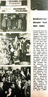 Davetiyeleri Erol Günaydın kendi eliyle dağıttı : Dormen'de Hayat gecesinin hikayesi çok önceden başlamıştı. Yaygara 70'in Ajans Bahriye'si, Erol Günaydın sahne kıyafetiyle semt semt İstanbul'u dolaştı sırf Hayat okuyucuları için oynanan 200. geceye onlara davetiyelerini kendi eliyle dağıttı. Araba vapurundan, Kuaför Vecihi'nin salonuna kadar girip çıkmadığı yer kalmadı. Oyunun 200. gecesinde davetliler saat 20.00'den itibaren tiyatro girişinde toplanmaya başlamışlardı (Yanda üstte). Beşiktaşlı olan Erol Günaydın balıkçı dostlarını da unutmadı, verdiği davetiyelerin karşılığında onlar da ona bir kalkan balığı hediye ettiler (ortada). Site talebe yurduna da uğrayan sanatçının etrafı öğrenciler tarafından bir anda böyle sarıldı (altta)...1970 |