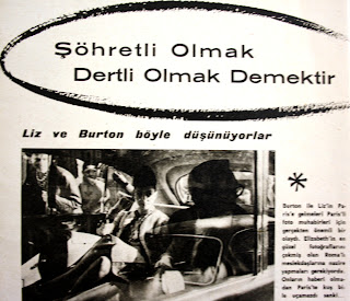Şöhretli olmak dertli olmak demektir. Liz ve Burton böyle düşünüyorlar. Burton ile Liz'in Paris'e gelmeleri Parisli foto muhabirleri için gerçekten önemli bir olaydı. Elizabeth'in en güzel fotoğraflarını çekmiş olan Romalı meslektaşlarına nazire yapmaları gerekiyordu. Onların haberi olmadan Paris'te kuş bile uçamazdı sanki... |
