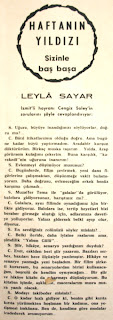 HAFTANIN YILDIZI SİZİNLE BAŞ BAŞA : LEYLA SAYAR İzmitli hayranı Cengiz Soley'in sorularını şöyle cevaplandırıyor : S : Uğura, büyüye inandığınız söylüyorlar. Doğru mudur ? C : Batıl inançlarımın olduğu doğru. Ama bugüne kadar büyü yaptırmadım. Arada bir kurşun döktürürüm. Birkaç muska taşırım. Yolda Arap görürsem kulağımı çekerim. Buna karşılık kara renkli kedinin uğuruna inanırım. S : Evlenmeyi düşünüyor musunuz ? C : Bugünlerde film çevirmek, yeni dans figürlerine çalışmaktan düşünmeye vakit bulamıyorum. Daha doğrusu evleneceğim erkek henüz karşıma çıkmadı. S : Muzaffer Tema ile galalarda görülüyor, balolara gidiyorsunuz. Barıştınız mı ? C : Galalara aynı filmde oynadığımız için birlikte gidiyoruz. Balolara ise tertip heyetleri bizi beraber görmeye alıştığı için adlarımıza davetiye yolluyorlar. Yalnız gidersek ayıp olur diye birlikte gidiyoruz. S : En sevdiğiniz rolünüzü söyler misiniz ? C : Belki ileride daha iyisine rastlarım ama şimdilik "Yaban gülü"... S : Şiir, hikaye, senaryo yazdığınızı duyduk ? C : Evet, eskiden beri şiir yazarım. Bazıları serbest, bazıları hece ölçüsüyle yazılmıştır. Hikaye ve senaryo yazmaya yeni başladım. Bir film şirketi kurarsam bu senaryolardan birisini kullanacağım ve baş rolü de kendim oynayacağım. Bir şiir ve hikaye kitabı da çıkarmayı düşünüyorum. Bu kitabın içinde aşklarım, maceralarım mısra mısra yazılı olacak. S : Modayı takip eder misiniz ? C : O kadar hızlı gidiyor ki, benim gibi kırıta kırıta yürümekten hoşlanan bir kadının bu hıza yetişmesi imkansız. Ben de kendime göre modalar icat ederek avunuyorum... |