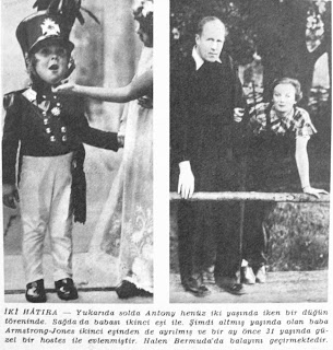 İKİ HATIRA Yukarıda solda Antony henüz 2 yaşında iken bir düğün töreninde. Sağda da babası ikinci eşi ile. Şimdi 60 yaşında olan baba Armstrong Jones ikinci eşinden de ayrılmış ve bir ay önce 31 yaşında güzel bir hostes ile evlenmiştir. Halen Bermuda'da balayını geçirmektedir...1960 |