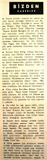 BİZDEN HABERLER * Çocuk artistler arasına bir yenisi katıldı. Şantör Armağan Şenol'un kızı Parla Şenol, Nilüfer Koçyiğit'in yerine Efgan Efekan, Neşe Yulaç, Birsen Menekşeli ve Ahmet Tarık Tekçe'nin oynadığı "Benim küçük meleğim"de rol aldı. Filmin enteresan tarafı artistlerin filmde kendi isimleriyle oynamaları. Küçük Parla filmde şarkı söyleyen Efgan'a döndü, yaşından beklenmeyen bir söz söyledi : "Bay Efgan, Bay Efgan sende babam gibi şarkı söylemek istiyorsan önce nota dersi al !" * Rejisör Halit Refiğ, Yılmaz Duru'dan ayrılmış olan Nilüfer Aydan ile önümüzdeki ayın ortasında evleniyor. Nikahtan sonra hemen Zonguldak'a gidecekler. Orada kendi başlarından geçmiş olayları işleyen "Sevmek bizim suçumuz" adlı filmi çevirecekler. * Sadettin Erbil "Bir gecelik gelin" filminde 11 defa evlenip boşanmış olan Orhan Günşiray'ı savunan bir avukat rolündeydi. Müdafaasına şöyle başladı : "Şu masum müvekkilime bakın" dedi. "Müvekkilim çok iyi bir aile içinde yetişmiş olup ortaokulu bile ikmalsiz bitirmiştir !" * Film yıldızı Peri Han, Bulvar tiyatrosuna girdi. "Bana çiçek yollama" piyesinde oynuyor. Bu arada bir İtalyan gazetesinin muhabiri ile Hilton'da konuşan Peri Han'ın bu gazetede bir foto röportajı çıkacak. * On yıllık bir aşk geçen hafta evlenmeyle sonuçlandı. Bestekar Baki Çallıoğlu, İzmir Fransız lisesi mezunlarından Güngör Çırpıcı ile Beyoğlu evlenme dairesinde nikahlandı. Yeni evliler balayını Uludağ'da geçirecekler. * Rejisör Hicri Akbaşlı, İstiklal caddesinde yürürken saatine baktı ve stüdyoya geç kaldığını görünce hızlı hızlı yürümeye başladı. Bu sırada önüne çıkan otomobili görmedi ve otomobile çarptı. Şimdi, bacağından yaralandığı için film çeviremiyor. Amerika'ya gitmekten de vazgeçti. Çevireceği filmin adı "Aman yavaş yürü"dür. * Film galaları için artistlerin Anadolu'daki prömiyerlere gitmeleri modası aldı yürüdü. Şubat ayında boş oldukları için Salih Tozan ile Öztürk Serengil bir galaya gitmişlerdi. Artistleri sahnede halka takdim eden spiker : "İşte" dedi. "Yukarıdaki perdede cansızlarını, aşağıda da şu canlılarını görüyorsunuz..." dedi. Öztürk Serengil dayanamadı : "Yahu, hayvanlardan bahseder gibi tanıtma !" diye çıkıştı. Gösterilen filmin adı : "Biz insan değil miyiz ?" idi... * Sülün Osman gündelik gazetelerin polis haberleri sütunlarını doldurmuş. Sattığı meydan saatleri tramvaylarda tefrika konusu olmuştu. Şimdi tövbekar olan ünlü dolandırıcının serüvenleri "Sülün Osman" adıyla filme alınıyor. Rejisörlüğü Metin Erksan yapıyor. "Sülün Osman" rolünde Orhan Günşiray oynuyor. Bu yıl Günşiray'ın oynadığı dört filminde de adı "Osman". * Amerika'da Dallas şehrinde "Hello baby, hello love" filminde oynayan Türk aktörü Mümtaz Alparslan, Columbia pictures film şirketiyle beş yıllık bir kontrat imzaladı. Ayrıca İstanbul'da çevirdiği "Korsan" filmini de İngilizce dublajıyla Amerikan Leone Inc. şirketine satan Alparslan, İstanbul'da bir filmde daha oynadıktan sonra Amerika'ya dönecek. * Gönül Yazar bundan birkaç ay önce otomobiliyle yaşlı bir kadına çarpmıştı. Asliye ceza mahkemesinde yapılan ikinci duruşmada şahitler dinlendi. Duruşma bilirkişi raporu için başka güne bırakıldı...1962 |