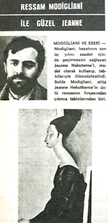 Ressam Modigliani ile Güzel Jeanne Modigliani ve Eseri : Modigliani hayatının son 3 yılını saadet içinde geçirmesini sağlayan Jeanne Hebuterne'i model olarak kullanıp tablolarıyla ölümsüzleştirdi. Üstte Modigliani, altta Jeanne Hebuyterne'nin ressamın elinden çıkmış tablolarından birisi. 1917 yılında yağmurlu bir sonbahar akşamı Paris'te küçük bir lokantada karşılıklı masalara oturmuşlardı. Erkek 33 yaşında hastalıklı ve borç içindeydi ve ümitsizdi. Kız ise 19'unda ya var ya yoktu. Ümit ve hayat dolu bir akademi öğrencisiydi. Birbirlerinin varlığından habersiz yemeklerini yerlerken nasıl olduysa oldu ümitsiz erkeğin bakışları hayat dolu genç kızınkiyle birleşti. Böylece çağımızın ölümsüz aşklarından biri doğmuş oldu. Gençlik günlerini geride bırakmış olan ümitsiz genç ressam Modigliani'den başkası değildi. 19 yaşındaki Jeanne Hebuterne, Modigliani'yi yeniden hayata kavuşturmak için elinden geleni yaptı. Ne yazık ki hastalıklar bu talihsiz ressamın yakasını bırakmadı. 1920 24 Ocak gecesi hayata gözlerini kapadı. Bir süre sonra da Jeanne beşinci kattan kendini atarak intihar etti. 1970 Hayat Dergisi. |