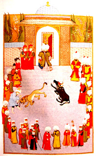 Sultan 2. Bayezid'in huzurunda Tunus sultanının hediye ettiği bir aslan ile su sığırının mücadelesi minyatürü.