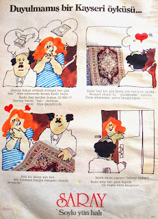 Duyulmamış bir Kayseri öyküsü... Zeynep hanım evlendi evleneli her gün "Halı" diye tutturdu kocası Kadir bey'e. Kadir bey nereden bulsun 30.000'i ? Zeynep hanım "Halı" dedikçe, "Yarın" diye geçiştirdi. Kadir bey bir gün Saray yün halılarını gördü... Rivayet olunur ki "Yüreğinden" vuruldu. Önce albenisine sonra hesaplı oluşuna... Aldı bir Saray yün halı, açtı karısının baygın bakışları altında salonda ! Şimdi ne mi yapıyor Zeynep hanım ? Kadir bey'i her gece kapıda bir başka türlü karşılıyor... Saray Soylu yün halı (1977) |