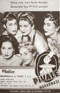 Halep orda, arşın burada demişler, denemişler hep Piyale yemişler... Piyale Makarnası Maktaş makarnacılık ve ticaret t. a. ş. Satış büroları : İzmir : Belediye karşısı erler 901 sokak no. 15/1 Telefon : 23431 İstanbul : Yağ iskelesi duvar dibi no: 12 Telefon : 27 11 98 (1957) |