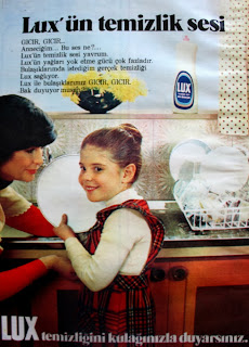 Gıcır... Gıcır... - Anneciğim bu ses ne ? - Lux'ün temizlik sesi yavrum... Lux'ün yağları yok etme gücü çok fazladır. Bulaşıklarımda istediğim gerçek temizliği Lux sağlıyor. Lux ile bulaşıklarımız gıcır gıcır bak duyuyor musun ? Lux temizliğini kulağınızla duyarsınız...1977 |