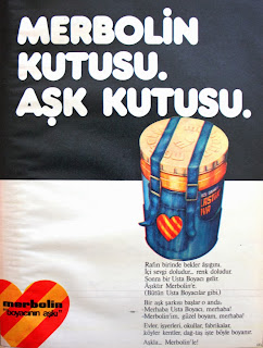 Rafın birinde bekler aşığını. İçi sevgi doludur renk doludur. Sonra bir usta boyacı gelir. Aşıktır Merbolin'e. (Bütün usta boyacılar gibi) Bir aşk şarkısı başlar o anda, -Merhaba usta boyacı, merhaba ! -Merbolin'im, güzel boyam, merhaba ! Evler, işyerleri, okullar, fabrikalar, köyler kentler dağ taş işte böyle boyanır. Aşkla... Merbolin'le ! Merbolin boyacının aşkı...1977 |