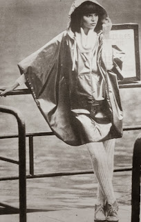 Norbert Nel'in bu yağmurluk modeli ilginç tasarımı ile dikkat çekmekte. İki yanda çıtçıt ile kapanan kap şeklindeki yağmurluğun boyu dizin hayli üzerinde. Kapüşon büzülerek boyun altından bağlanmakta. Balıkçı yakalı kazak ve uzun yün örgü çoraplarla giyilen model giyen bayanlara çok şirin bir hava katmakta...1977 |