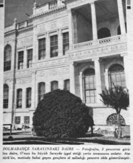 Dolmabahçe sarayındaki Daire : Fotoğrafta üç penceresi görülen daire. Onun bu büyük sarayda işgal ettiği yerin tevazusunu anlatır. Atatürk'ün metinde bahsi geçen gençlere el salladığı pencere okla gösterilmiştir. |