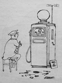 sonrası pompayı seyretmekle yetinen müşteri ve benzin pompası (1975)