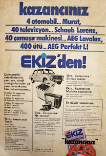 Ekiz sabun tozu kazancınız Çamaşırdaki üstünlüklerinin yanı sıra, şimdi armağanlarından da yararlanacaksınız ekiz sabun tozunun... 63.00'er TL değerinde 4 Murat otomobili, 5.000'er TL değerinde 40 Schaub-Lorenz televizyonu, 4.000'er TL değerinde 40 Aeg lavalux çamaşır makinesi, 250'şer TL değerinde 400 Aeg Perfekt l ütüsünü kazanacaksınız. |