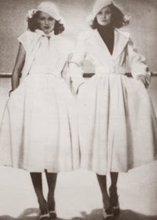 Jean Louis Scherrer'in beyaz flanel kumaştan hazırladığı mantolardan sağdaki geniş yakalı ve uzun kollu. Bedenden büzgülü olan manto belde geniş bir kemerle toplanmakta. Soldaki manto kısa japone kollu. Göğüs üzerinde iki cep almakta.Mantonun belini 1975'in modası kemer süslemekte. Kıyafete aksesuar olarak bere ve eşarp seçilmiş. |