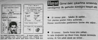 * İlk Kıbrıs şehidinin kimlik kartı : 20 Temmuz sabahı çıkartmanın başladığı sırada çıkartma gemisinin radar direğinde vurularak şehit düşen sivil elektrik işçisi Ahmet Ersoy'un kimlik kartı. Hayat, Girne'deki çıkartma sırasına verdiğimiz ilk şehidin kimliğini tespit etti. 20 Temmuz günü... Sabahın ilk saatleri. Türk çıkartma gemileri Kıbrıs açıklarında... Düşman mevzilerinden gemilerimizin üzerine ateş yağıyor... 20 Temmuz... Gemiler kıyıya iyice yaklaştı... Ve radar direğindeki işçi Ahmet Ersoy düşman mermisiyle vurulup ilk Türk şehidi olarak can veriyor. |