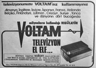 Televizyonunuzu Voltam'sız kullanmayınız. Almanya, İngiltere, İsviçre, İspanya, Fransa, Hollanda, Belçika, Finlandiya, Lübnan, Cezayir, Suriye, Tanca ve dünyanın dört bucağında milyonların kullandığı regülatör Voltam televizyon el ele Dünyada rakipsiz Voltam regülatörleri 1600 watt'a kadar çeşitleriyle de tüm elektronik cihazlarınızın, kompüter ve muhasebe makinelerinizin hizmetindedir. (1975) |