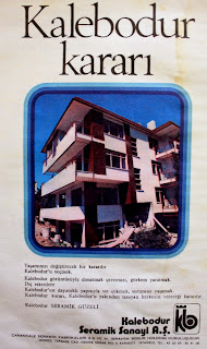 Kalebodur kararı... Yaşamınızı değiştirecek bir karardır Kalebodur'u seçmek. Kalebodur görüntüsüyle donatmak çevrenizi, görkem yaratmak. Dış etkenlere Kalebodur'un dayanıklı yapısıyla set çekmek, sorunsuz yaşamak. Kalebodur kararı Kalebodur'u yakından tanıyan herkesin vereceği karardır. Kalebodur Seramik Güzeli Kalebodur Seramik Sanayi A. Ş. Çanakkale seramik fabrikaları a. ş. ve H. İbrahim Bodur holding kuruluşudur... Merkez : Tersane cad. Hediye sokak no : 6 Karaköy - İstanbul Tel : 43 03 55 - 45 51 00 (1976) |