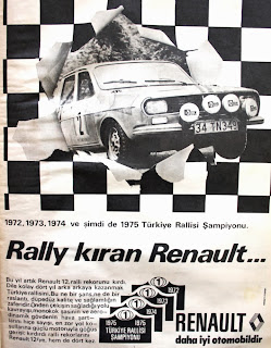 1972, 1973, 1974 ve şimdi de 1975 Türkiye rallisi şampiyonu Rally kıran Renault... Bu yıl artık Renault 12 ralli rekorunu kırdı. Dile kolay dört yıl arka arkaya kazanmak Türkiye rallisini. Bu ne bir şans, ne de bir rastlantı. Düpedüz çekişin sağladığı yolu kavrayışı, monokok şasinin ve aerodinamik gövdenin hava şartlarını hiçe sayışı, en zor yol koşullarına güçlü motoruyla göğüs gerişi kırdırdı ralli rekorlarını Renault 12'ye, hem de dört kez... Renault daha iyi otomobildir...1975 |