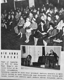 Bir anma töreni Geçen yıl kaybettiğimiz Prof. Dr. Nihat Reşat Belger'in ölümünün birinci yıl dönümü münasebetiyle Galatasaray lisesinde bir anma töreni tertiplendi. Merhumu sevenlerin ve öğrencilerin katıldığı bu anma toplantısında saygı duruşundan sonra kürsüye gelen hatipler, kıymetli ilim adamının çeşitli yönlerini belirten konuşmalar yaptılar...1962 |