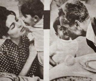 Mesut bir aile tablosu... Genç kraliçe Farah oğlu küçük prens Ali Rıza'yı öpüyor. İkinci resimde şah yanağını uzatmış öpücük bekliyor... |