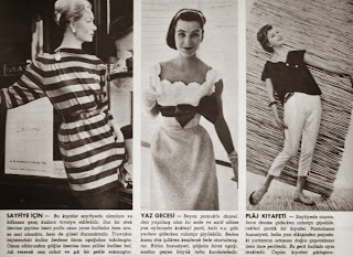 Sayfiye için : Bu kıyafet sayfiyede olanlara ve bilhassa genç kızlara tavsiye edilebilir. Dar bir etek üzerine giyilen üzeri yollu uzun jarse bluzlar hem ucuza mal olmakta hem de güzel durmaktadır. Truvakar biçimindeki kollar bedene biraz aşağıdan takılmıştır. Onun altlarından göğüs üzerine inen pliler bluza bolluk vererek onu rahat ve şık bir şekle sokmuştur. Yaz gecesi : Beyaz pamuklu dantelden yapılmış olan bu sade ve zarif elbise yaz aylarında kokteyl parti, balo vs. gibi yerlere giderken rahatça giyilebilir. Beden kısmı düz iplikten kesilerek bele oturtulmuştur. Bütün hususiyeti göğsün biraz aşağısından geçen büyük tafta kurdelededir. Plaj kıyafeti : Sayfiyede oturanların denize giderken rahatça giyebilecekleri pratik bir kıyafet. Pantolonun hususiyeti belin yan dikişinden paçadaki yırtmacın ortasına doğru çaprazlama inen ince şerittedir. Bu şerit bluzla aynı renktedir. Cepler kıyafeti şıklaştırır...1957 |