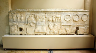 Lahit yüzü tipinde mezar taşı - Gravestone in style of sarcophagus facade İstanbul Çiftehavuzlar kazılarından, geç Helenistik dönem İ. Ö. 1. yüzyıla aittir. Mezar taşı Ariston oğlu asker Ariston ile karısı Gykeia'ya aittir. Kabartmada her ikisinin kişisel eşyaları betimlenmiştir. İstanbul Arkeoloji Müzesi |