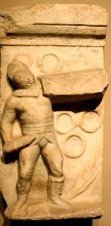 Gladyatör Mentor'un mezar steli - Grave stele of Mentor the gladiator Mermer Tralles (Aydın)'dan Roma dönemi İ. S. 2. yüzyıla ait "Ben Mentor, ünlü stadyumlarda herkesi yenip kadere göre öldüm. Güçlü Moira beni Hades'e sürükledi ve şimdi bu mezarda yatıyorum. Hayatım Amarantos'un kanlı ellerinde son buldu..." İstanbul Arkeoloji Müzesi |