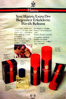 Yeni Hattric Extra Dry Beğenilen Erkeklerin Büyük Kokusu Günümüzde erkekler için hazırlanmış bir bakım serisi sadece bakım sağlamaktan başka şeyler de vermek zorundadır. Bu nedenle Hattric Extra Dry'ın kusursuz bakım özellikleri yanında büyüklüğünü, başkalığını duyuran özel bir kokusu da vardır. Erkeksi, buruk, güvenli ve kadınların erkeklerde aradıkları bir başkalık. İşte Hattric'in bu özelliklere sahip mamulleri... Olivin Almanya (1975) |