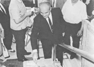 Vali Poyraz 2 Haziran sabahı hava güneşli ve sıcaktı. Sandık başları erken saatlerde daha kalabalık oldu. Saat 10'u 5 geçe vali Poyraz ve eşi Mahinur, Rumeli caddesindeki 120 no'lu sandığa gelerek reylerini kullandılar. Vefa Poyraz reyini kullanırken epey neşeliydi...1968 |