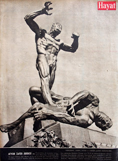 Afyon Zafer Abidesi Düşmandan ilk kurtulan vilayetimiz Afyon'dur. 13 Temmuz 1921'de işgal edilmiş olan Afyon, 13 ay 14 gün düşman işgalinde inledikten sonra 27 Ağustos 1922'de kurtulmuş, düşmanı aman vermeden takip eden 8. tümen saat 17.30'da Afyon'a girerek vilayet konağına bayrağımızı çekmiştir. Yukarıdaki anıt düşmanın o gün nasıl bir hırsla ezildiğini göstermek için milli orduya ve büyük kurtarıcı Atatürk'e Afyonluların şükran hatıraları olarak Afyon'da dikilmiştir. Fotoğraf : Basın yayın ve turizm umum müdürlüğü 1957. |