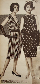 Simli reye ve puanlı kumaştan dikilmiş iki sade rop. Cep kapaklarının süslediği reye elbisenin kemeri, kumaşın siyah yolları bir araya getirilerek yapılmıştır. Puanlı elbise kemersizdir... 1962