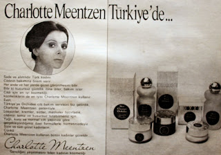 Charlotte Meentzen Türkiye'de... Sade ve alımlıdır Türk kadını Cildinin bakımına önem verir. Her anda ve her yerde güzel görünmesini bilir. Bilir ki kusursuz güzellik itina ister, bakım ister. Cildi için en iyi kozmetiği. Kozmetiklerin de en iyisi Charlotte Meentzen kullanır. Evet... Türkiye'ye orchidee cilt bakım servisini biz getirdik, charlotte meentzen patentiyle... Losyonlar, kremler, sütler, maskeler hazırladık. Cildinizi temiz ve kusursuz tutabilmek için. Yağlı, kuru ve normal cilt yapınıza göre gerçekleştirdiğimiz özel formüllerle hizmetinizdeyiz. Sizin ve tüm güzel kadınların... Çünkü Charlotte Meentzen kullanan bütün kadınlar güzeldir... Charlotte Meentzen Gençliğini yaşatmasını bilen kadının kozmetiği. (1975) |