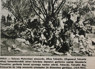 Mola Sakarya muharebesi esnasında, albay Fahrettin (orgeneral Fahrettin Altay) kumandasındaki süvari kolordusu düşmanın gerilerine yaptığı hücumlarla Yunanlıları gerilerde kuvvet ayırmaya mecbur ederdi. Yukarıda Fahrettin bey Sakarya'da bir takip esnasında arkadaşları ile dinlenirken görülüyor... 13 Eylül 1921 (1958 Hayat dergisi) |