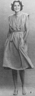 Yılın bol ve büzgülü hatlarını başarıyla yansıtan model Philippe Venet moda evine aittir. Önden bele kadar düğmeli elbise, yaka çevresi ve omuzdan inen büzgülerle bolluk kazanarak belde aynı kumaştan bir kuşakla toplanmakta. Çok kısa kollu japone elbise turuncu şantungtan hazırlanmıştır. 1975 |