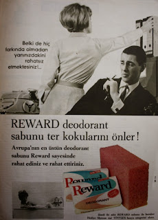 Belki de hiç farkında olmadan yanınızdakini rahatsız etmektesiniz ! Reward deodorant sabunu ter kokularını önler ! Avrupa'nın en üstün deodorant sabunu Reward sayesinde rahat ediniz ve rahat ettiriniz... Şimdi iki adet Reward sabunu ile beraber hediye mercan tipi vinylex banyo süngerini alınız...1968 |