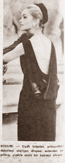 Siyah krepten, arkasındaki dekolteyi süsleyen drapesi satenden yapılmış çiçekle süslü bir kokteyl elbisesi... 1962