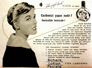 Daha güzel olmak Scherk ile başlar... Cazibenizi yapan nedir ? Harikulade teninizdir ! Ancak fevkalade berrak bir yüz tenine sahip olan kadınlar hakikaten güzel ve cazip sayılır. Siz de, Scherk (lotion faciale) yüz losyonunun bahşettiği tazeliğe hiç zahmet çekmeden kavuşabilirsiniz. Derhal sihirli tesirini gösteren Scherk (lotion faciale) yüz losyonu cilde nüfuz eder, mesamelerde biriken kirleri kökten temizler ve cildin her hücresine yepyeni bir hayatiyet bahşederek tene harikulade bir tazelik verir. Teninize bu imkanı vermekte geç kalmayınız sizi derhal inandıracak olan Scherk tecrübesini bugünden deneyiniz... İşte inandırıcı Scherk tecrübesi Yüzünüzü mutadınız veçhile iyice yıkayıp temizleyiniz. Sonra bir parça pamuğa biraz Scherk (lotion faciale) yüz losyonu katınız ve yüzünüze ovarak sürünüz. Pamuk kirlenir, cildiniz tertemiz olur ! Yüzünüzde fevkalade bir rehavet hissedersiniz. Scherk lotion faciale yüz losyonu (1958) |
