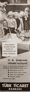 Havuz dolunca bu ördek yavrusu kendisi için hazırlanmakta olan suda yüzecek ! Siz de, çocuğunuzun istikbalini hazırlayınız ! Kendisi için bankamızda açtıracağınız bir ikramiyeli grup mevduatı hesabı ona : * Ömür boyunca aylık irat * 30.000 liraya kadar sermaye * Zengin para ikramiyeleri * Apartman daireleri kazanma şansı sağlar. Türk Ticaret Bankası (1958) |