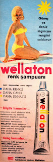 Güneş ve deniz saçınızın rengini soldurur. Wellaton renk şampuanı deniz banyosundan sonra saçınızı daha renkli, daha canlı, daha sıhhatli yapar. Küçük hanımlar Gözlerinize rimel, yüzünüze allık, dudaklarınıza ruj sürerek çehrenize hayatiyet verirken, saçlarınızı da renklendirmeyi unutmayınız. Wellaton renk şampuanı sayesinde saçlarınız rüyalarınıza giren renklere kavuşarak daha parlak, daha canlı, daha cazip olacaktır. Genç hanımlar... Saçlarınız hafif kırlaşmış ise wellaton bunları maskeleyecek ve saçlarınızın güzelliği gençliğin bütün coşkunluğu ile yüzünüzü süsleyecektir. Koleston fabrikalarının harikası wellaton ! (1963) |