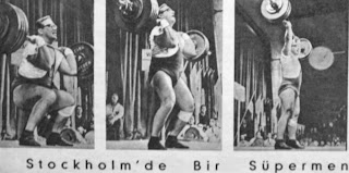 Stockholm'de bir Süpermen Stockholm'de yapılan halter müsabakasında Moskovalı Süperman Yury Vlasov muntazam, koparma, silkme toplamda 557,50 kg ile yeni bir dünya rekoru yaparak fevkalade bir performans gösterdi. Yury, büyük gayret sarfı ile kaldırılması gereken bu kadar ağırlığı dikkati çekecek kadar sakin şekilde kolaylıkla kaldırmaktadır. Bir demircinin oğlu olan Moskovalı Süperman radyo tekniği ve mühendisliği tahsil etmiştir. 27 yaşında ve 131.50 kg olan Yury, aynı zamanda memleketinde yazar ve filozof olarak tanınır. Bu da gösteriyor ki, akıl ve adale kuvveti ahenkli bir şekilde birleşince rekorlar daha rahat kırılıyor... Resimde Süperman 212.50 kg'u rahatça kaldırırken göstermektedir... 1963 |