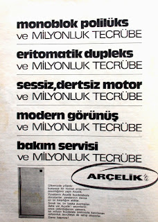 Monoblok polilüks ve milyonluk tecrübe Eritomatik dupleks ve milyonluk tecrübe Sessiz, dertsiz motor ve milyonluk tecrübe Modern görünüş ve milyonluk tecrübe Bakım servisi ve milyonluk tecrübe ARÇELİK'te Ülkemizde yıllardır kusursuz bir hizmet anlayışının öncülüğünü yaptı Arçelik. Yuvalarını Arçelik buzdolabıyla donatanlar, paralarının daima en iyi karşılığını aldılar. Şimdi ise, bir başka avantajları daha var Arçelik'i seçenlerin : Onca üstünlüğünün yanı sıra bir milyon buzdolabı üretimiyle kanıtlanan milyonluk tecrübeye de sahip oluyorlar. Darısı başınıza ! (1975) |