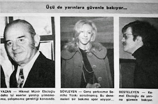 Üçü de yarınlara güvenle bakıyor... Yazan : Hikmet Münir Ebcioğlu daha iyi eserler yaratıp Eurovision'da yılmamamız, çalışmamız gerektiği kanısında. Söyleyen : Genç şarkıcımız Semiha Yankı sarsılmamış. Bu denemeleri bir bakıma spor sayıyor... Besteleyen : Kenan Ebcioğlu'da yarına güvenle bakıyor...1975 |