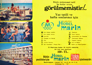 Böyle mükemmel tatil bu kadar ucuza görülmemiştir...! Yaz tatili ve hafta sonlarınız için Kumburgaz Hotel Marin Her odada telefon, her odada banyo, kalorifer, otopark ve servis, plaj, yüzme havuzu, bar amerikan (havuz bar), restoran, oyun salonu, ultra modern bir diskotek, televizyon salonu, toplantı salonu, yat ve motor, kadın ve erkek kuaförü 15 Haziran'a kadar iki kişilik odalarda bir kişi tam pansiyon 160.- TL Bütün yenilikleriyle Hotel Marin Tura turizm işletmesidir. (1975) |