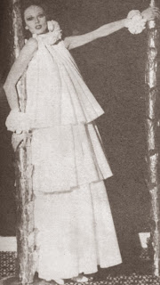 Serge Lepage moda evi kumaşa benzer bir cins kağıttan değişik bir model sunmaktadır. Üç kat geniş volandan oluşan gelinliğin yakası kare dekoltedir. Modelin kolsuz oluşu sıcak yaz günleri için çok elverişli görülmektedir. Yaka ve kolları çiçekler süslemektedir...1975 |