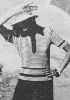 Tricosa kreasyonu etek-bluz havasını veren elbisesi çizgili beden ve düz renk etekten oluşmakta. Kısa kollu elbisenin bedeni ince lastik örgüdür. Etek parçalı ve evaze. Kıyafeti kenarlı şapka ve kemik bilezikler tamamlamaktadır. Etek boyu ise dizin altındadır...1975 |
