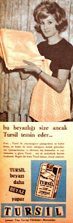 Bu beyazlığı size ancak Tursil temin eder... Evet... Tursil ile yıkayacağınız çamaşırların ne kadar beyaz, ne kadar da temiz olduğunu derhal göreceksiniz. Çamaşırlarınızı ve ellerinizi hiç bozmadan ve yıpratmadan iş gören Tursil... Sizi de muhakkak hayran bırakacak. Bugün bir kutu Tursil almayı ihmal etmeyin... Tursil beyazı daha beyaz yapar. TURSİL Çamaşır tozu Turyağ fabrikaları mamulüdür. (Reklam Moran 1962) |