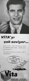 Vita'yı çok seviyor... Bunda haklıdır, çünkü vita emsalsiz lezzeti ile yemekleri enfes yapar. Üstelik hazmı da çok kolaydır. Vita asidi alınmış en iyi nebati yağlarla yapılmaktadır. Memnun çünkü vita sayesinde yemekleri iyi hazmediyor. Vita yemeğin lezzeti, midenin dostudur... (1963) |